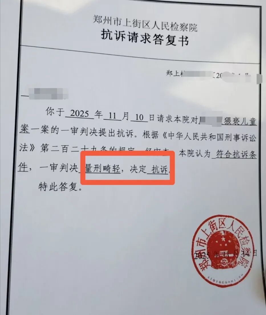 有强奸前科的六旬老汉诱骗猥亵7岁女童获刑两年,女孩家属以“量刑畸轻”申请抗诉。11月18日,受害女童母亲尚女士向记者确认,已收到郑州市上街区人民检察院作出的抗诉请求答复书。检方经审查认为,该案一审判决量刑畸轻,符合抗诉条件,决定提出抗诉。